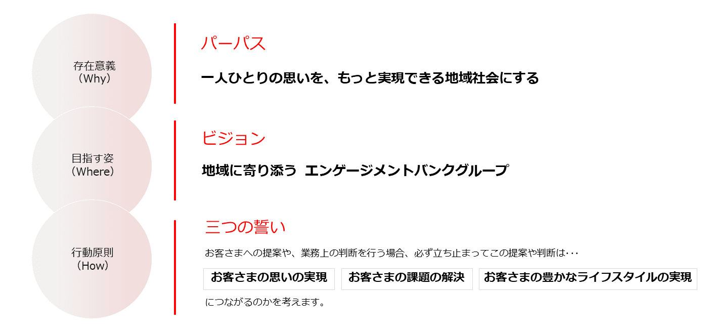 千葉銀行グループは、役職員一人ひとりがパーパス・ビジョンに基づいた行動を日々実践していくため、「三つの誓い」を定めています。この行動原則は、パーパス・ビジョンと役職員の行動を結びつけ、組織全体を支える拠り所となるものです。 共感を軸に、役職員自らが主体的に行動できる組織文化を醸成するために、私たちは今後もパーパス・ビジョンの浸透に向けた取組みを継続していきます。そして、役職員一人ひとりが「三つの誓い」を体現することを通じて、お客さま一人ひとり・一社一社、そして地域社会全体に対して「最高の価値」を提供し続けていきます。