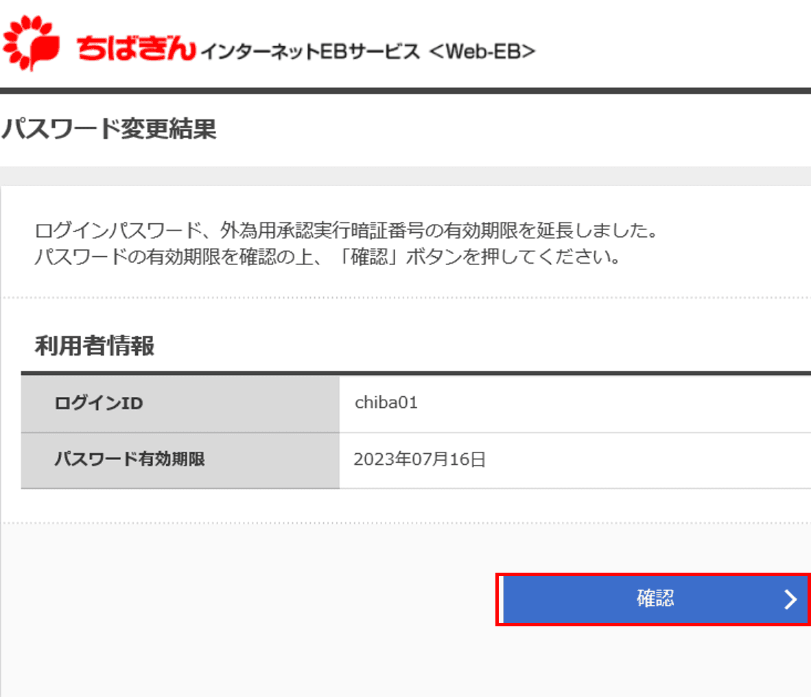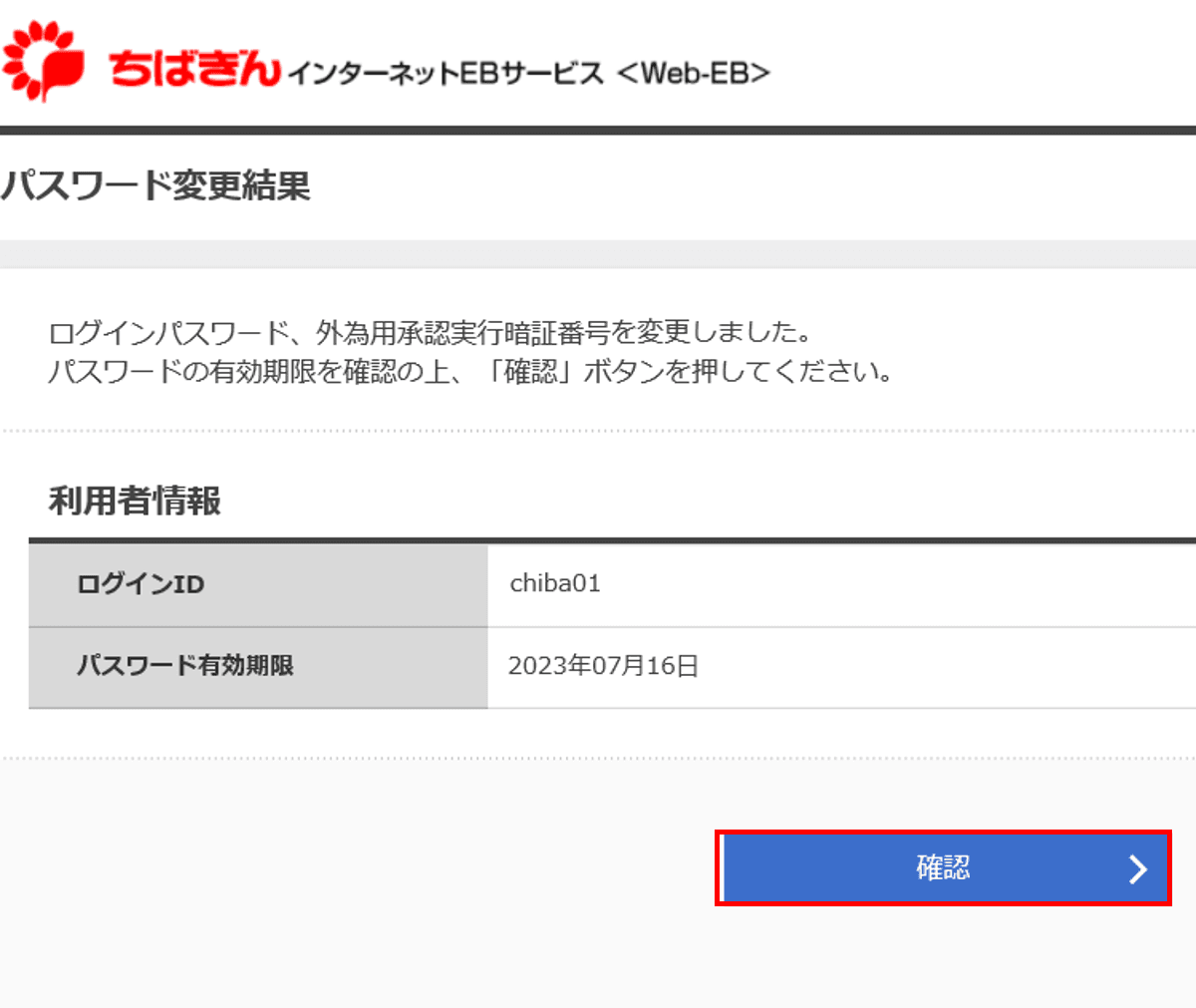 2.パスワード変更結果画面が表示されます。「確認」をクリックします。 A.変更した場合