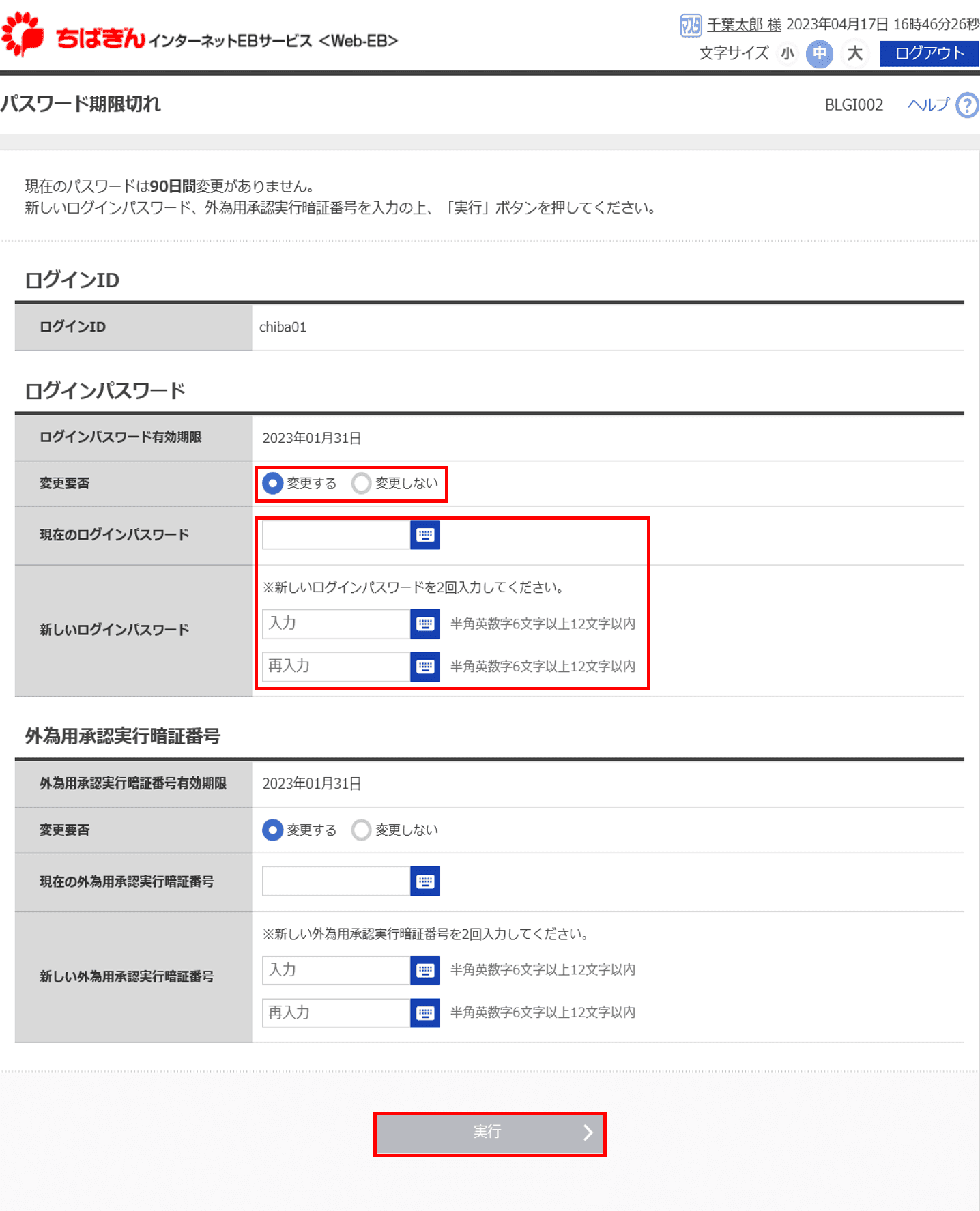 ※外為用承認実行暗証番号は、外為サービスの承認操作権限をお持ちのユーザ様のみ表示されます。外為用承認実行暗証番号が表示される場合には、ログインパスワードと同様にご操作ください。 ※セキュリティ上、変更することを極力お勧めします。また、本画面にて変更しなくても、ログイン後にメンテンナスの利用者管理より、ログインパスワードを変更することが可能です。定期的にご変更をお願いします。