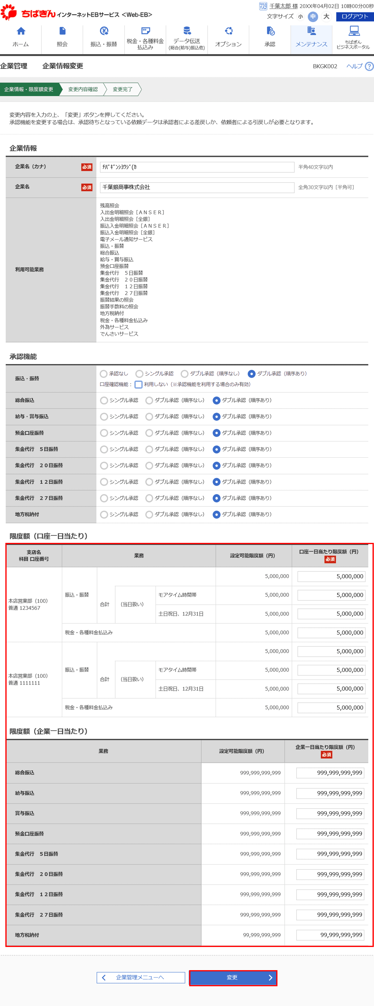 5.限度額を確認し、必要に応じて金額を調整し、「変更」をクリックします。