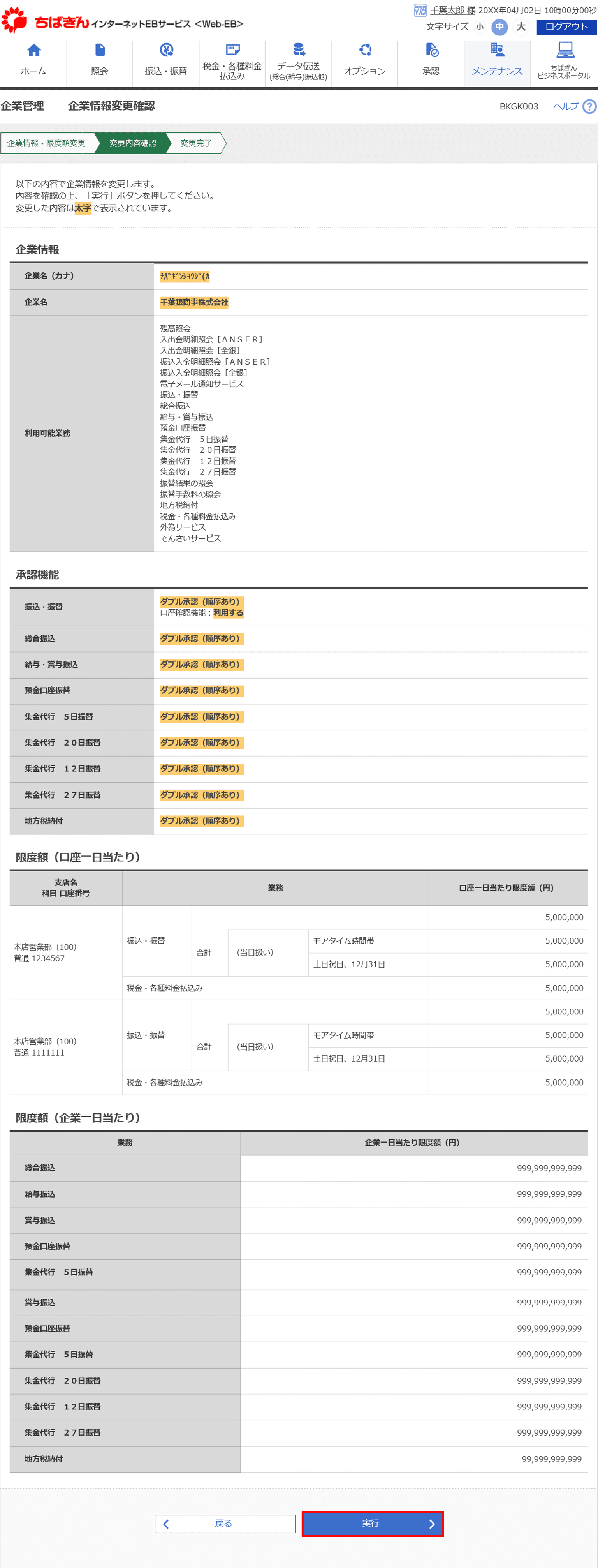 7.以上で企業様の設定を変更が完了です。 続きまして、各ユーザの限度額を変更する必要があります。