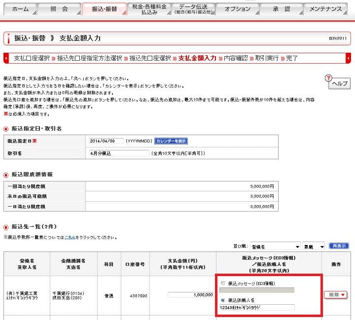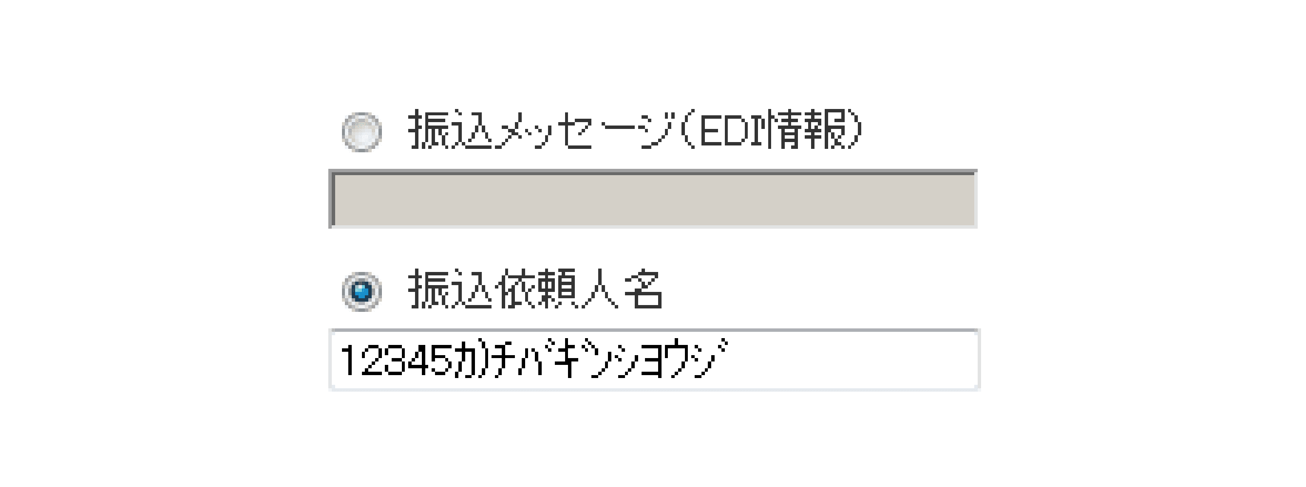 ・振込メッセージ(EDI情報) EDI情報とは、受取人に対して一定のメッセージを伝えるためのメモ欄で、受取人にもEDI情報を閲覧できるインターネットバンキング等の環境が必要です。受取人よりEDI情報へ入力依頼があった場合のみ、入力してください。 ・振込依頼人名 受取人の振込入金時の通帳印字において、支払口座名義から変更したい場合に入力をして下さい。例えば、受取人より振込依頼人の前に番号等を入力するよう依頼があった場合には、番号等を入力し続けて依頼人名を入力してください。 ・振込・振替操作時の入力例