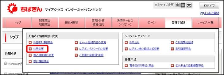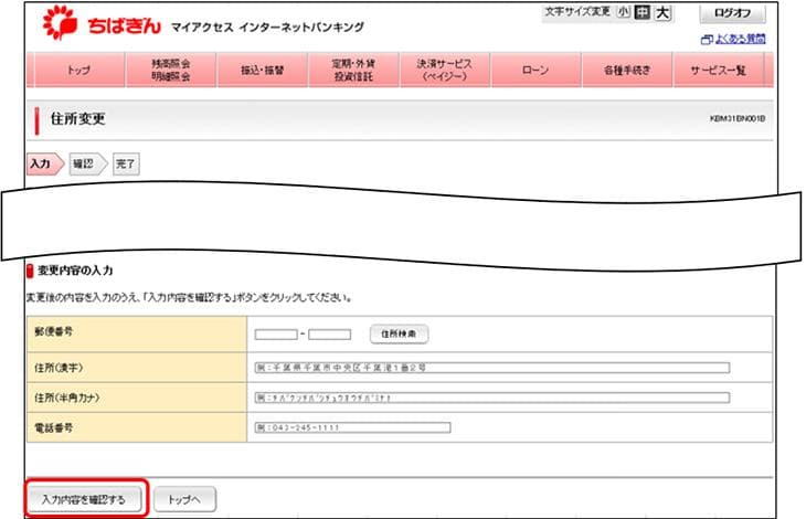 【ワンタイムパスワードアプリもしくはトークンをご利用のお客さま】 インターネットバンキングにログオン後、「各種手続き」→「住所変更」からお手続きいただけます。電話番号のみ変更する場合は、住所欄を空欄にしたまま、変更後の電話番号のみを入力してください。(変更内容は、最短翌日反映します。取引内容によっては、2~3営業日かかることもあります。) ただし、投資信託やローン等のご利用がある場合、インターネットバンキングで住所変更はできません。お手数ですが、お取引店の窓口でお手続きください。なお、投資信託やローン等のご利用がある場合でも、電話番号のみの変更は上記の方法でお手続きいただけます。 1.「各種手続き」→「お客さま情報照会・変更 住所変更」