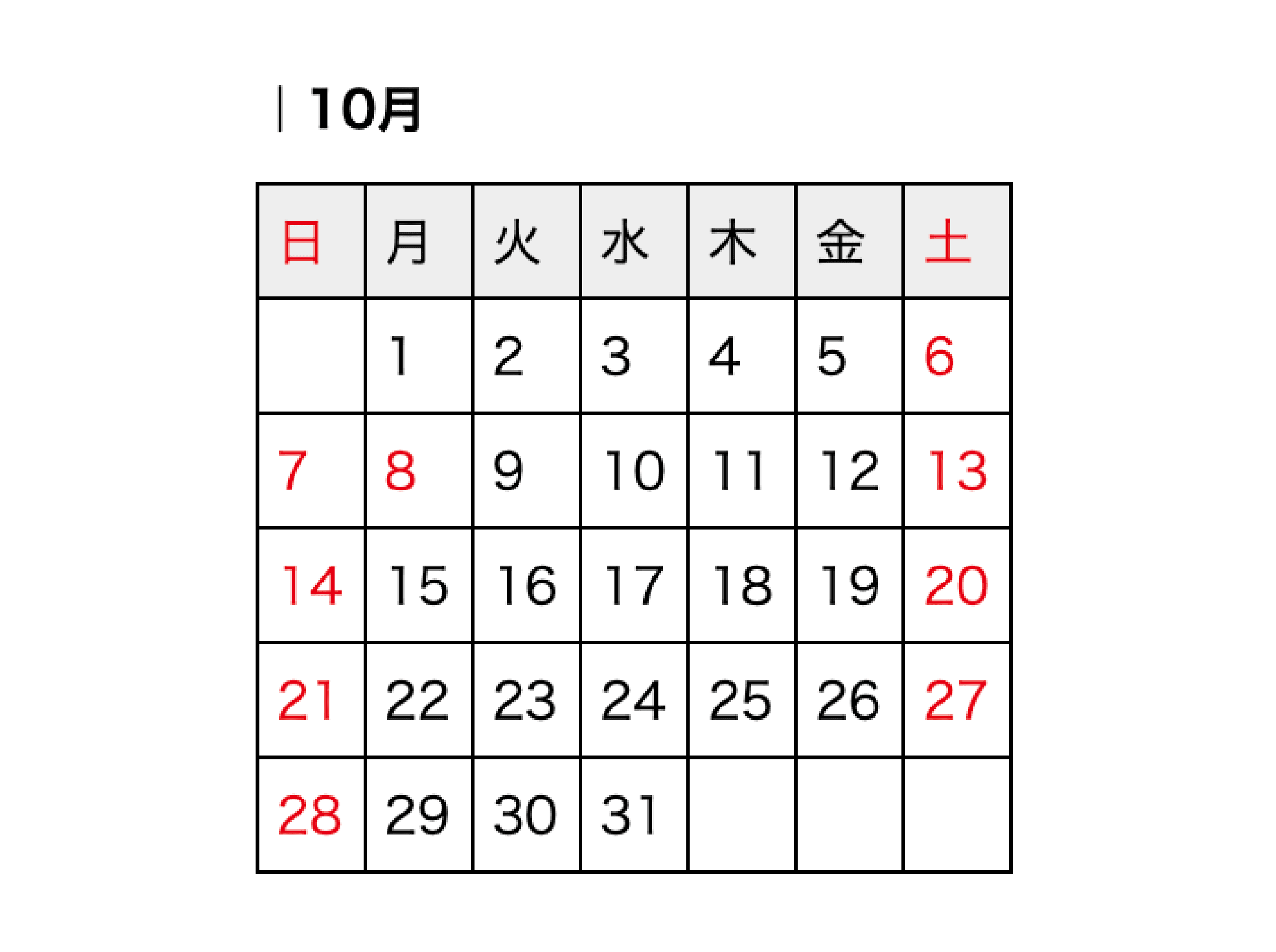 このような曜日の月で、10月10日が指定日の場合は、 前営業日 ・・・ 10月9日 2営業日前 ・・・ 10月5日 3営業日前 ・・・ 10月4日