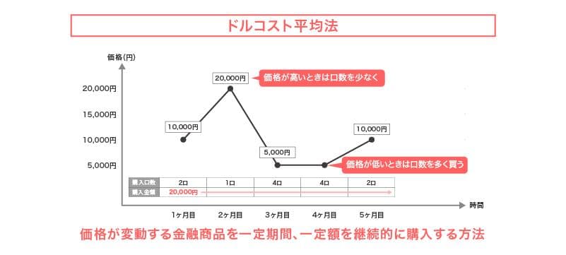 投資信託のおすすめの買い方は、ドル・コスト平均法(定額投資)です。ドル・コスト平均法は、定期的な間隔で一定の金額を投資し、市場の値動きに左右されない長期資産形成を狙います。 市場価格が高いときには購入する口数は少なくなりますが、市場価格が低い時には購入口数が増えます。これにより、長期的な市場の価格変動を平均化する効果が生まれ、投資のリスクを分散できます。 「予算2万円で毎月定期的に購入する」という運用方法の例を見てみましょう。