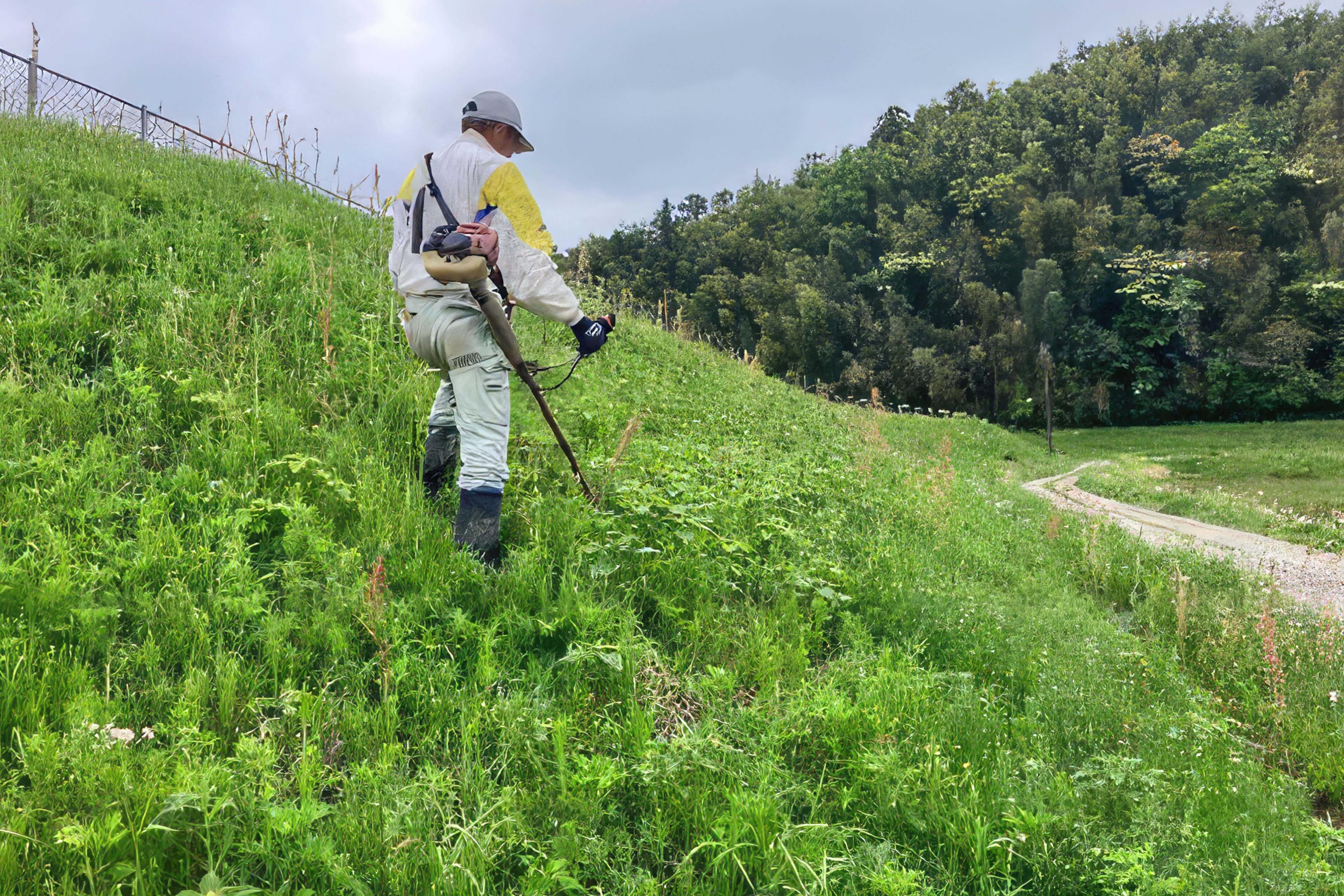 傾斜のきつい法面(のりめん)での除草作業は、担い手不足の一因ともされる重労働。
