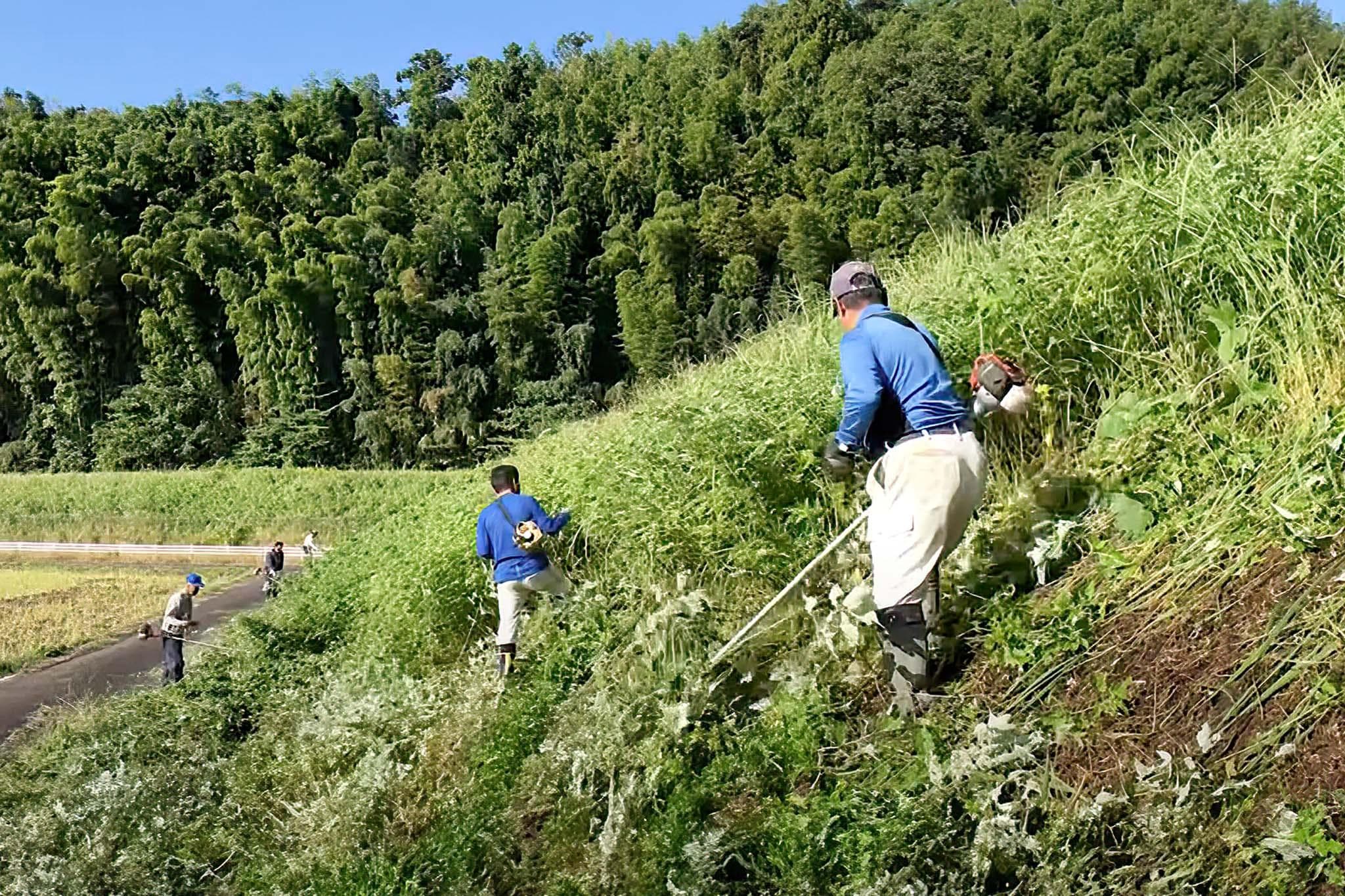 千葉県は全国でも収穫の時期が早く、9月上旬には刈り取りが終わることも少なくありません。 そんな日々の営みのなかで、特に手間がかかるのが草刈りの作業。田んぼといえば、平らな土地に整然と並んでいるのどかな田園風景を思い起こすことでしょう。しかし、同じ田んぼでもさまざまな地形があり、皆吉地区では法面(傾斜地)が多く存在しています。そのため、法面用の自走式草刈機もありますが、機械が届かない場所も多くあり、法面の草刈りは肩掛け式草刈機を用いて下から刈り上げていきます。