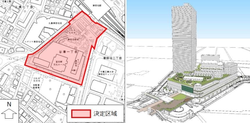 ↑津田沼駅南口地区第一種市街地再開発事業 決定区域とイメージスケッチ JR津田沼駅南口では、習志野市の玄関口としてふさわしい魅力ある街づくりを目指し、市街地再開発事業が進められています。 再開発では、時代のニーズに応える商業施設の整備や、「音楽のまち習志野」を象徴する文化ホールの再建設が計画されています。これにより、文化とにぎわいを生み出す新しい拠点づくりを目指します。 また、駅前広場の再整備や企業バス乗降場の新設を通じて、バスや一般車の乗り降りがしやすい環境を整備予定です。移動の利便性が向上しそうですね! さらに、駅前には高層マンションの建築も計画されています。 緑豊かで活気のある駅前環境を整え、「歩きたくなるまち」をコンセプトにした津田沼駅南口エリア。今後の変化に注目です! ※プランは計画中のものであり、今後変更になる可能性があります。