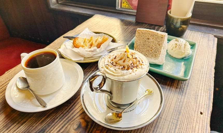 昭和38年創業の老舗店で、ヨーロッパ風の外観はどこか懐かしさを感じさせます。内装にもこだわりがあり、手書きのメニューが温かみを感じさせるお店です。 私が注文したのは、紅茶のシフォンケーキ(アイスクリーム添え)とカフェ・カプチーノ。 シフォンケーキはふんわり軽やかで、紅茶の香りがふわっと広がり、さっぱりなめらかなバニラアイスとの相性が抜群でした。 カフェ・カプチーノは、生クリームとシナモンの香りが華やかで、贅沢なひとときにぴったり。 新メンバーのやまもが注文していたホットアップルパイもとても美味しそうで、ぜひまた訪れたいです。