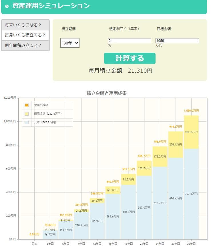 今回の条件では、想定利回り2%で月21,310円の積立設定、当初入金額はなしで1,044万円の目標金額に達する結果となりました。 ただしシミュレーションを行う際の注意点として、投資信託の利回り(1年あたりの利益率)は、一定ではありません。ある年はプラス8%でも、またある年はマイナス5%になることもありえます。シミュレーションは計画を立てる際に便利ですが、利回りのブレが考慮されていない点に注意しておいてください。 上記シミュレーションでは利回りのブレを考慮し、一般的な想定利回り3-5%よりも数値を低めに設定して試算を行っています。 ちばぎんマネーガイドでは、ライフプランシミュレーションをご用意しています。 簡単な質問に答える事で、将来の資金シミュレーションが可能です。