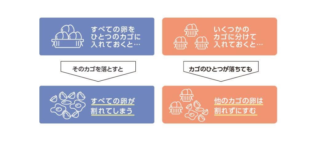 左側の図のように、1つのカゴに全ての卵を入れてしまうと、カゴを落とした時に全て割れてしまいます。これを資産運用に置き換えてみると、1つの企業の株式等に全財産を投資した場合に万が一倒産してしまったら、資産の全てがなくなってしまう、というような意味合いです。 金融業界においてのポートフォリオは「リスクの分散」という目的を持ち、もし1つの資産に何かが起こっても資産全体での影響を抑えられるものになっています。