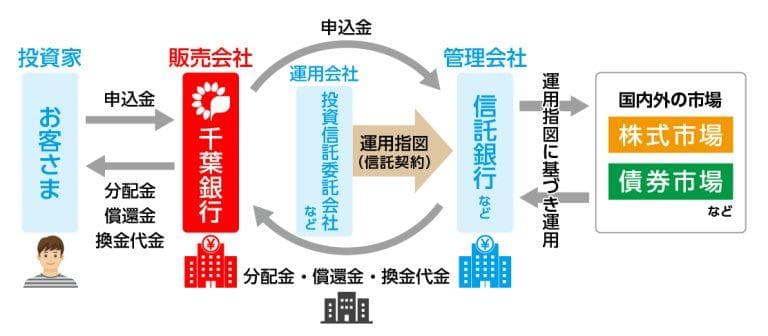 お客さまから集められた資金の流れでいうと、下記のようになっています。 <投資信託の資金の流れ> 【投資までの流れ】 1.お客さまから資金を集める 2.集められた資金は販売会社を通じて管理会社へ 3.運用会社が管理会社へ運用指示を出し、管理会社から国内外の資産へ投資が行われる 【収益が反映される流れ】 1.投資によって生まれた利益は一旦管理会社へ 2.保有口数により、お客さまごとの利益を算出 3.販売会社を通じてお客さまへ利益が反映される