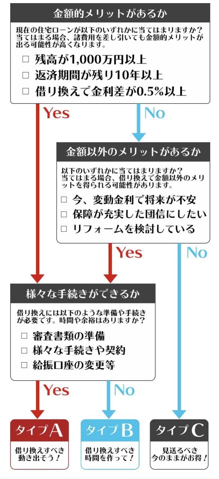 借り換えを行う前に「Yes/Noチャート」を使って損をしないタイミングを判断してみましょう。借り換える際には、住宅ローンの返済期間や残高、借り換え前後の金利差などにも注意する必要があります。