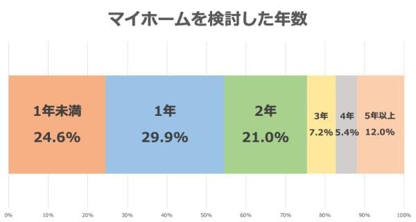 次にマイホームの購入を考え始めた年齢を聞いたところ、30~34歳が42.5%、次いで25~29歳が24.0%となりました。購入した年齢層と同様に、30代前半から検討し始めることが多いようです。では、実際に購入するまでには、どのくらいの期間があったのでしょうか?