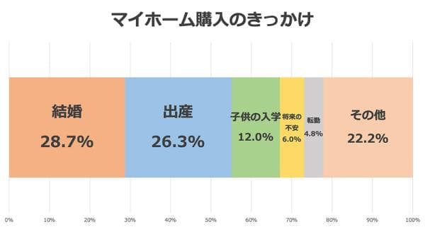 マイホームを検討し始めた年齢から購入に至るまでの期間を見てみると、もっとも多いのは「1年」で29.9%、次いで「1年未満」が24.6%でした。過半数の方が“マイホームが欲しい”と考え始めてから1年ほどで購入を決めていることがわかります。 1年未満という短い期間で購入したケースでは、「結婚後の新居を検討している際に、理想的な物件に巡り合えた」「子どもが生まれるので広い家を探していたら、ちょうどよい物件があった」など、タイミングのよさを挙げる意見が目立ちました。 一方、検討期間が5年以上となった方の理由を見てみると「実家の近くで探していたが、なかなかよい土地がなかったため」「子どもが生まれる前にも購入を検討していたが、転勤によって頓挫し、子どもの入学のタイミングで購入」など、さまざまな事情が見受けられます。 マイホーム購入を検討し始めてから、スムーズに行動に移せた方もいれば、紆余曲折あった方もいることがわかりました。では、どんなきっかけからマイホーム購入に至るケースが多いのでしょうか?