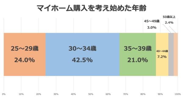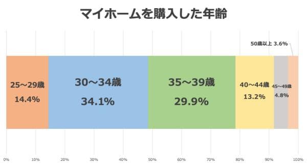 マイホームを購入した年齢は30~34歳がもっとも多く34.1%、次に35~39歳が29.9%を占めました。全体の64%が30代のうちにマイホームを購入していることがわかります。 その次に多いのが14.4%を占める25~29歳で、購入のきっかけとして「結婚」を挙げる方が約7割。理由としては「子どもが生まれる前に生活基盤を整えた」など、落ち着いた状態での子育てを望む声が目立ちました。 また、8割近くの方が40歳までに購入していることから、マイホームは若いうちに買うものという考えが今も根付いていると言えそうです。 しかし3.6%と少数ながら、50歳以上で購入された方もいました。購入した理由としては「(現在住んでいる建物の)老朽化」や「近所にいい分譲マンションができたから」などが挙がっています。