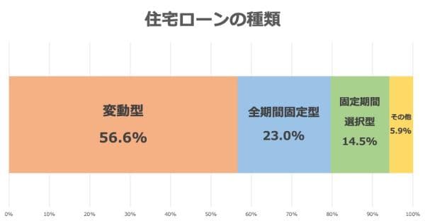 住宅ローンを「利用した」と回答した方に住宅ローンの金利タイプをお聞きしたところ、56.6%の割合で一般的に金利が低く設定される「変動型」を選んでいました。次いで「全期間固定型」が23.0%、「固定期間選択型」が14.5%と続きます。そのほか、変動型と固定型を併用する「ミックス型」を選んだ方や、「当初固定にしていたが変動に変えた」という意見も見られました。また、一戸建て or マンションというマイホームのタイプ別に比較してみても、やはり「変動型」を選ぶ方がもっとも多い結果となっています。