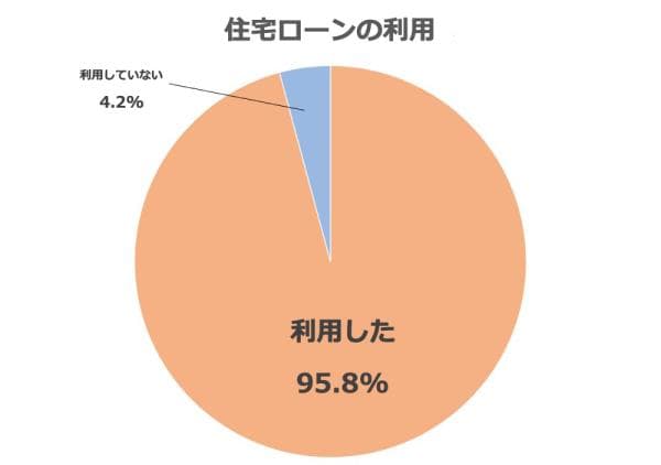 マイホーム購入の心強い味方、住宅ローンはいったいどれくらいの方が利用しているのでしょうか。アンケート結果を見てみると、95.8%もの方が「利用した」と回答しました。ほとんどの方が住宅購入に住宅ローンを活用していることがわかります。しかし、4.2%と少数ながら「利用していない」という方も。住宅ローンを利用していない方の半数以上は40歳以上だったため、若いうちからマイホーム資金を貯めていたことが伺えます。