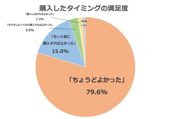 マイホームを購入したタイミングは、なんと79.6%の方が「ちょうどよかった」と回答されています。理由としては「子育てに十分な広さ、部屋数を確保できた」「子どもが1歳になり歩き始めるタイミングで、家の中に広い遊び場を用意できてよかった」など、子どもの成長に関する内容が多数。さらに「引っ越しにともなう子どもの転校を避けることができたため」「進学に合わせたため、子どもが新しい環境にすんなりなじめた」など子どもの入学・進学に関する理由も目立ちました。マイホーム購入のきっかけは「結婚」が最多でしたが、その先の「出産」や「子どもの入学」もしっかりと考慮すると、「ちょうどよかった」タイミングだと思えるようです。 そのほか「資材高騰や金利上昇前に購入できた」「消費税が8%のうちに購入できたから」など、経済的なメリットから「ちょうどよかった」と感じている意見も散見されました。「住宅ローンの金利が低かった」「住宅ローン控除の改正直前だったため」など住宅ローンに言及する声もあり、なかでも定年前に住宅ローンを完済できるタイミングで購入できてよかったとする声も目立ちました。