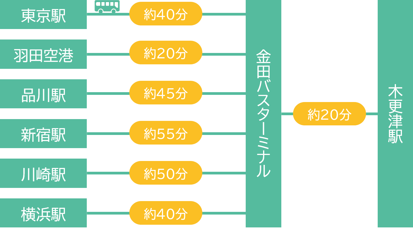 東京湾に面した房総半島の入り口である木更津市。沿岸部にはアウトレットモールをはじめ、大型の商業施設が多く立地する一方、内陸部には美しい上総丘陵が広がり、海と山の豊かな自然に囲まれたエリアです。また、東京湾アクアラインに近いため、駅やバスターミナルからは都心行きの高速バスが多く運行しています。そんな都心へのアクセスの良さと豊かな自然、温暖な気候に惹かれ、都心や他県から移住する子育て世帯が増加しています。 高速バス利用時のターミナル駅までの所要時間