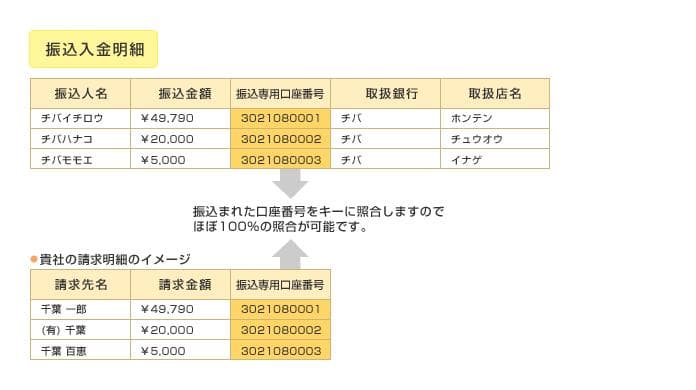 貴社の請求先(お振込人)ごとに別々の振込専用口座をご用意し、振込まれた口座番号によりほぼ100%の入金照合を実現する画期的なサービスです。