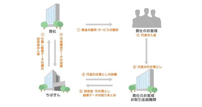 毎月の売上代金・諸会費等を、貴社のお客さまのお口座から引落し、貴社のお口座に一括してご入金するサービスです。