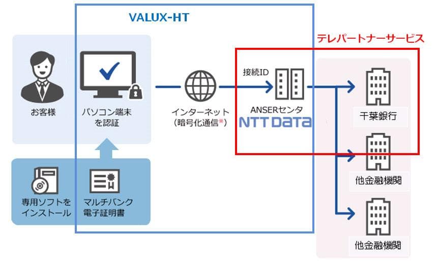 ※1.本サービスでは、(株)NTTデータ社が提供するVALUX-HT契約が必要となります。Valux-HTのお申込み方法につきましては、(株)NTTデータ社のValuxホームページにてご確認ください。 ※2.VALUX対応の専用ソフトは、ちばぎんコンピュータサービス(株)にて販売しております。くわしくは、ちばぎんホットライン(0120-203-004)へお問い合わせください。