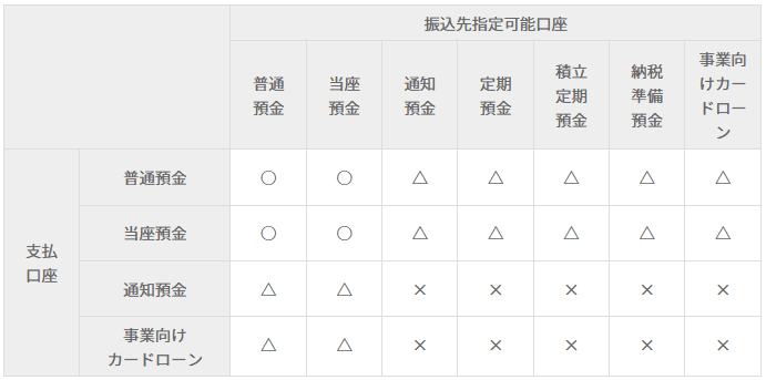 ○:ちばぎん本支店、他行宛ともに利用可能 都度指定方式、事前届出方式ともに利用可能 △:ちばぎん同一店自社口座間、かつ事前届出方式の振込指定日当日扱操作にて利用可能 ×:利用不可