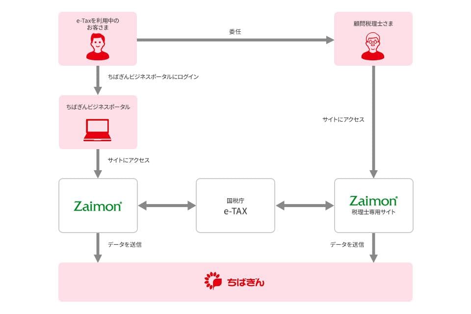 ※本サービスは、当行と株式会社NTTデータが利用契約(含む守秘義務契約)を交わしたうえで、株式会社NTTデータが提供する「Zaimon®e-Taxデータ受付サービス」(以下「Zaimon」といいます)を通じて千葉銀行にデータが送信されます。 ※顧問税理士さまが代理でデータ送信される場合は、下記専用サイトよりログインしてください。