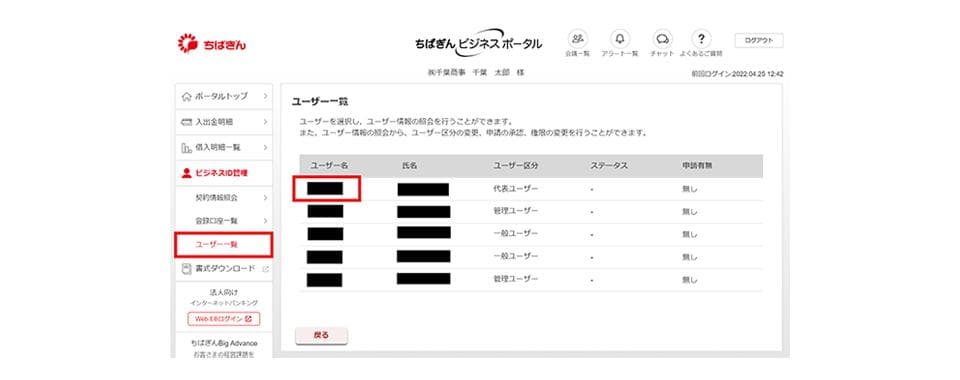 まずは、他行口座連携を使用するユーザーに対して「他行口座権限」(代表権限)を設定する必要がございます。代表ユーザーの方がちばぎんビジネスポータルにログインし、ユーザー一覧より権限を設定します。