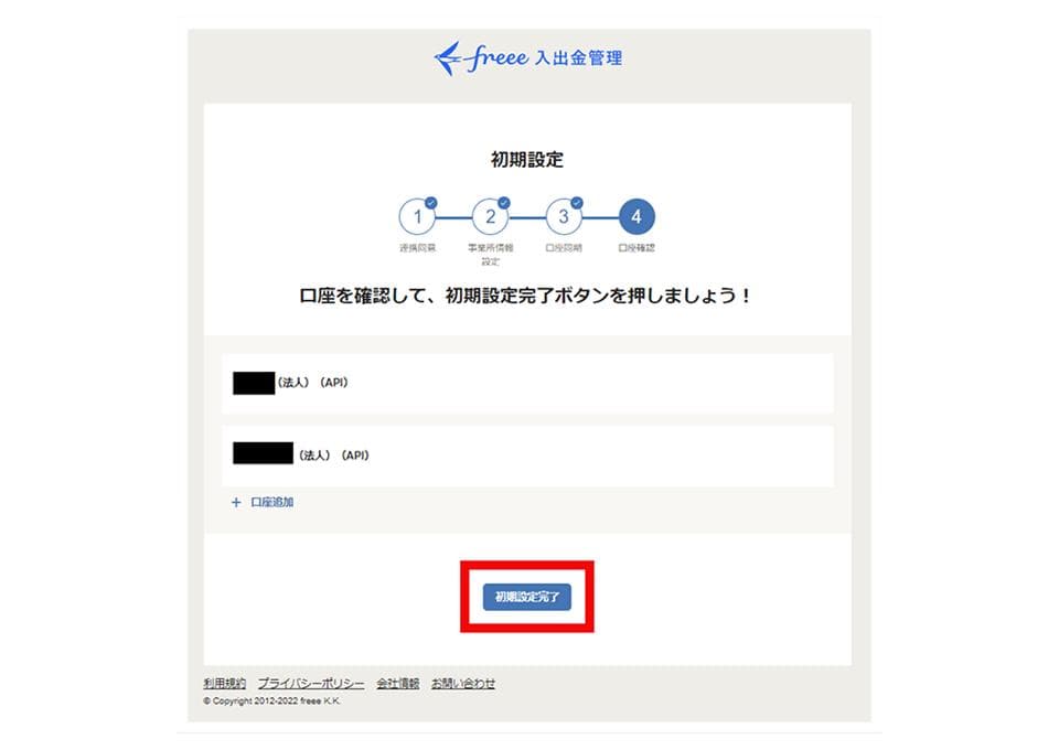 登録したい金融機関の口座選択が完了したら、「初期設定完了」を押下します。 設定完了後、30分程度で口座情報が反映されます。