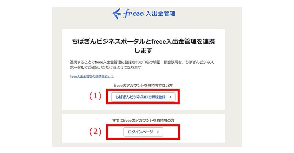 ※新たにfreeeアカウントを作成する場合は「(1)」を選択してください。 ※既にfreeeアカウントをお持ちの場合は「(2)」を選択してください。