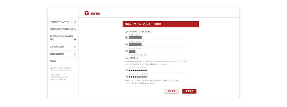 5.以上で、ユーザー名・パスワードの変更手続きは完了です。新しく登録したユーザー名・パスワードで、ちばぎんビジネスポータルにログインいただけます。