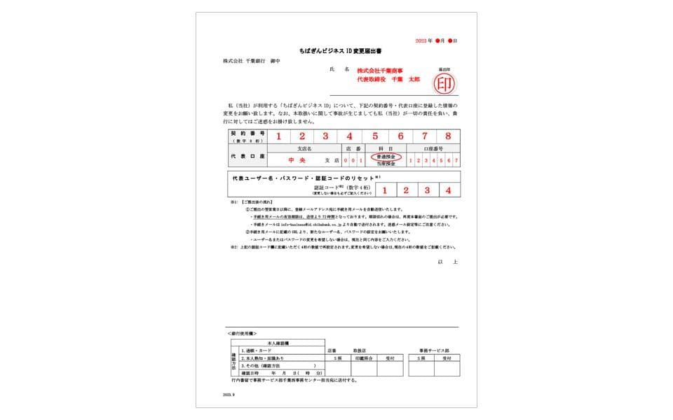 1.以下のボタンから「ちばぎんビジネスID変更届出書」を出力・印刷し、お名前・預金口座番号を記入し、お届出印を押印します。 ※「認証コード」欄には、新しく登録する4桁の数字をご記入ください。