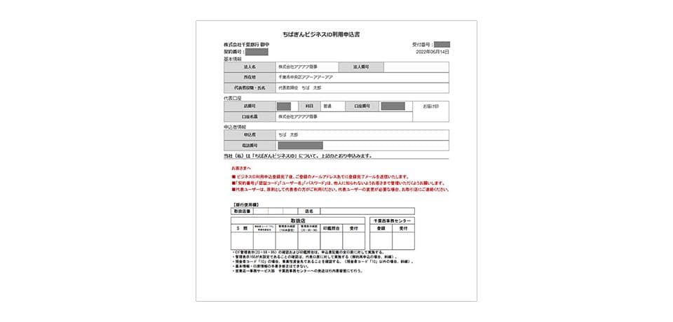 4.「ちばぎんビジネスID解約届」と「ちばぎんビジネスID利用申込書」を、お取引店にご提出ください。 5.当行において所定の手続き完了後、お客さまに登録完了メールが届きましたら、お手続きは完了です。新しい契約番号・ユーザー名・パスワードで、ちばぎんビジネスポータルにログインいただけます。