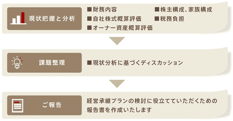 経営者のみなさまの身近な相談相手として、一緒に経営承継について考え、ロードマップを作成いたします。