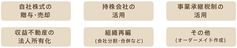 次世代を担う後継者には最低限の負担で事業を承継し、事業を発展させてほしい。 そんな想いに全力で応えます。株式承継についてのお悩み、株主構成についてのお悩みなど、さまざまなお悩みに対するソリューションの作成と実行のサポートを、私たちにお任せください。