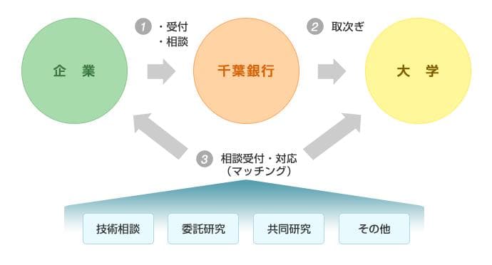 ちばぎんは、千葉大学・千葉工業大学・木更津工業高等専門学校・量子科学技術研究開発機構と、産学連携に係る包括協定を締結しております。新商品の開発・技術革新などで大学などの専門家に相談したい場合は、まずはちばぎんへご照会ください。ご相談内容に応じ、適切な専門家や研究者をご紹介するとともに、課題解決に向けたご支援をいたします。