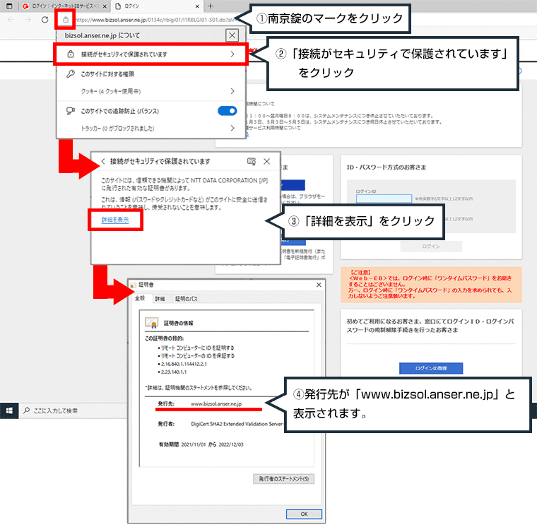 - 2.鍵マークをクリックすることにより、サイトの証明書をご確認いただけます。 証明書画面で発行先が「www.bizsol.anser.ne.jp」となっていることをご確認ください。