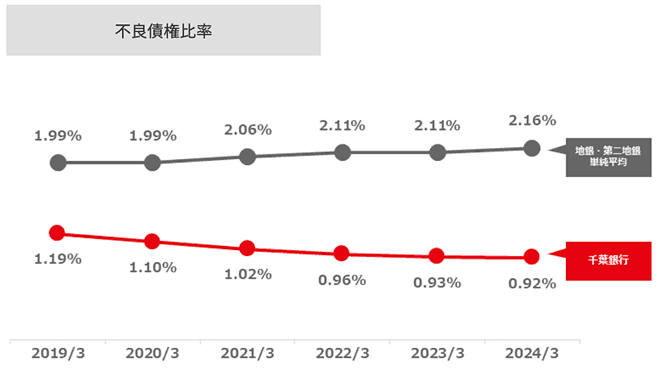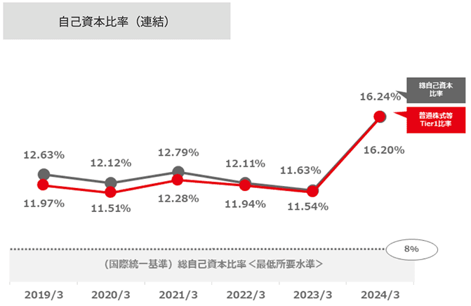 自己資本比率は国際的な所要水準を十分に上回っています。また、不良債権比率は地方銀行・第二地方銀行の平均を大きく下回り、高い健全性を有しています。