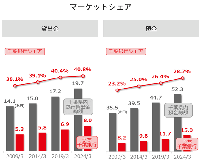 千葉県内の貸出金シェアは約40%、預金シェアは約28%であり、他の金融機関を上回って最も高く、今後もさらなる成長が期待される千葉県において圧倒的な顧客基盤を有しています。