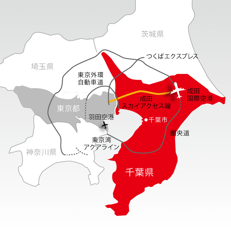千葉銀行の主要な営業基盤である千葉県は、人口・県民所得ともに全国6位の規模となっています。地理的条件や温暖な気候に恵まれ、農業・漁業が盛んなほか、東京湾沿岸に日本有数の工業地帯が形成されているなど、バランスのとれた産業構造を有しています。 また、成田空港をはじめ、首都圏各地に繋がる充実した交通網が人々の生活や企業の経済活動を支えています。今後も各種インフラ整備や開発案件が計画されており、さらなる成長が見込まれます。