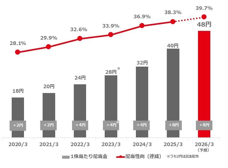 2026年3月期の1株当たりの配当金につきましては、年間48円とすることを予定しております。