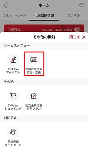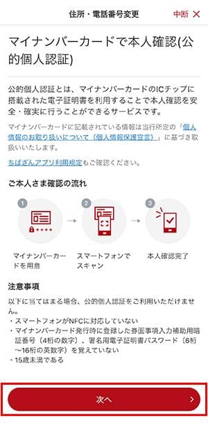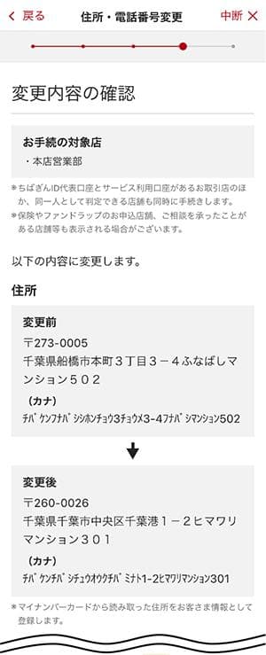 ※ちばぎんID代表口座とサービス利用口座があるお取引店のほか、同一人として判定できる店舗の口座も同時に手続きします。 ※15歳未満の方やマイナンバーカードの氏名が銀行の届出氏名と異なる方は本機能をご利用いただけません。 ※お取引内容や口座の状態により本機能をご利用いただけない場合があります。 ※変更内容の確認を行うため、変更が反映されるまでは数日お時間がかかります。お急ぎの場合は窓口でお手続きください。また、確認の結果はメールでお知らせします。