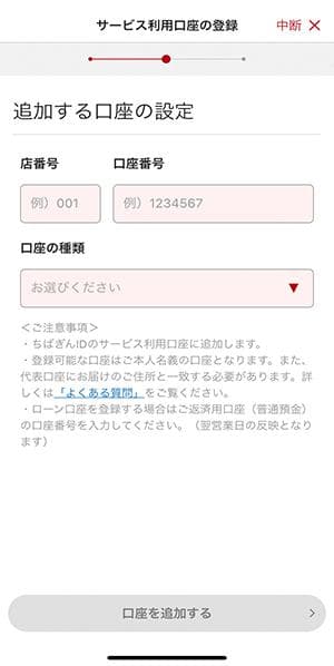 ちばぎんIDのサービス利用口座に追加できる口座は、代表口座と同一名義・同一住所のご本人さまの口座に限ります。