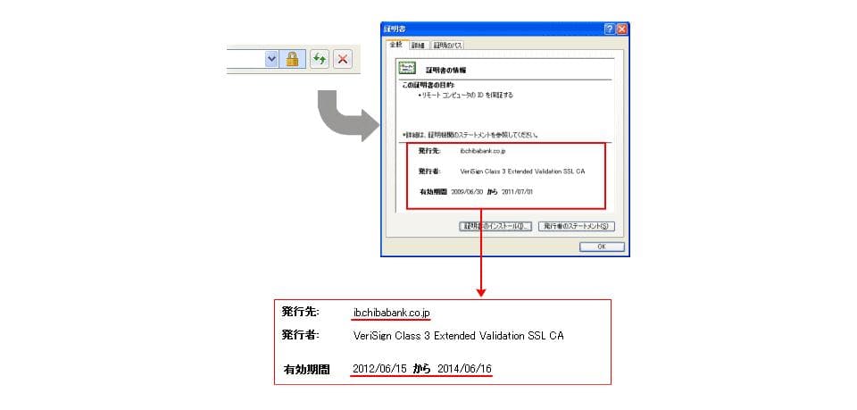 サイト証明書は、千葉銀行のインターネットバンキング取引画面と、お客さまのパソコンのブラウザとの間の通信が、SSL暗号化通信によって保護されていることを証明します。 ・証明書画面で、発行先が「ib.chibabank.co.jp」となっていることをご確認ください。 ・有効期限が切れていないことをご確認ください。