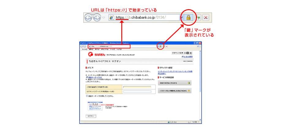インターネットバンキングご利用の際、ご契約者番号、パスワード等の個人情報を入力する前に、千葉銀行の正当なお取引画面へアクセスしていることを「URL」と「鍵マーク」により、必ずご確認ください。