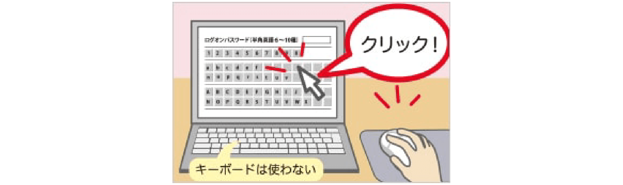 画面キーボードは、ログオンパスワードや確認番号の入力を、パソコンのキーボードではなく、画面上に表示するボタンをマウスでクリックすることで、入力していただく機能です。キーボードの操作履歴がパソコンに残らないため、パソコンのキーボードの入力情報を盗み、インターネット経由で第三者に送信するスパイウェアから、お客さまの情報を守ることができます。