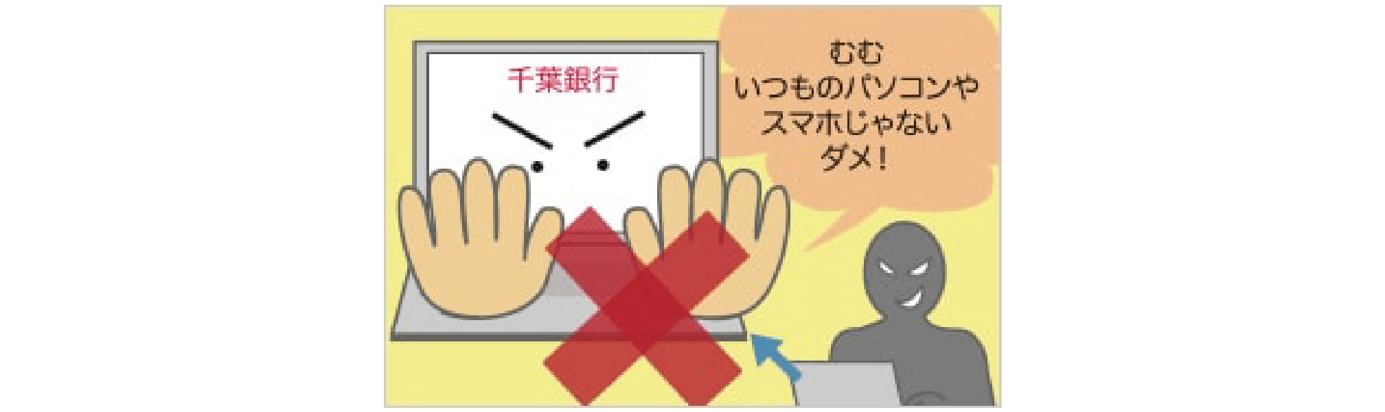 インターネットバンキングにログインする際のアクセス環境やネット環境などを分析し、お客さまが普段利用している環境とは異なる環境(端末情報等)からのリスクの高いアクセスの場合は、ログインできないようにします。