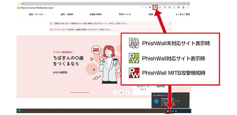 ※「PhishWallプレミアム」は、株式会社セキュアブレインが提供しているフィッシング・MITB攻撃対策ソフトです。 ※千葉銀行のホームページとインターネットバンキングは、フィッシング・MITB攻撃対策ソフト「PhishWall(フィッシュウォール)プレミアム」に対応しています。